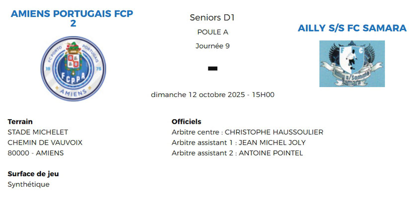 Jean-Michel Joly, pour la 4ème journée de championnat D1 groupe A, sera juge assistant pour la rencontre entre la réserve du FC Portugais d'Amiens (8ème) et le FC Ailly sur Somme Samara (1er) ; bon match Jean-Michel ! Score final : 1 - 0