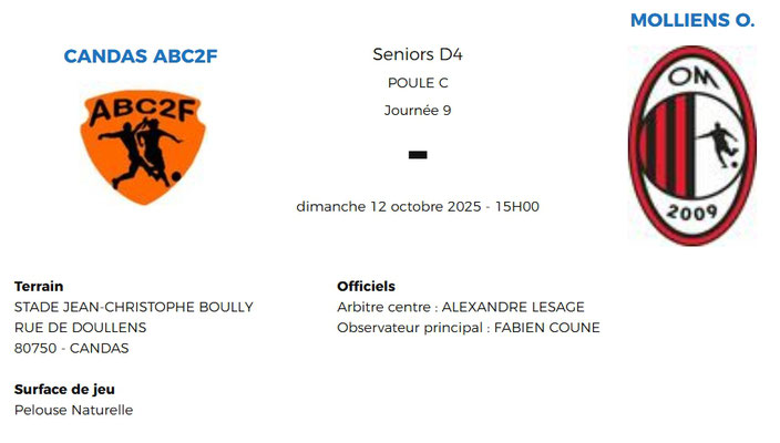 Alexandre Lesage, également pour la 4ème journée de championnat D4 groupe C, sera arbitre central pour la rencontre entre le ABC2F Candas (5ème) et l'Olympique Molliénois (9ème) ; bon match Alexandre ! Score final : 2 - 1